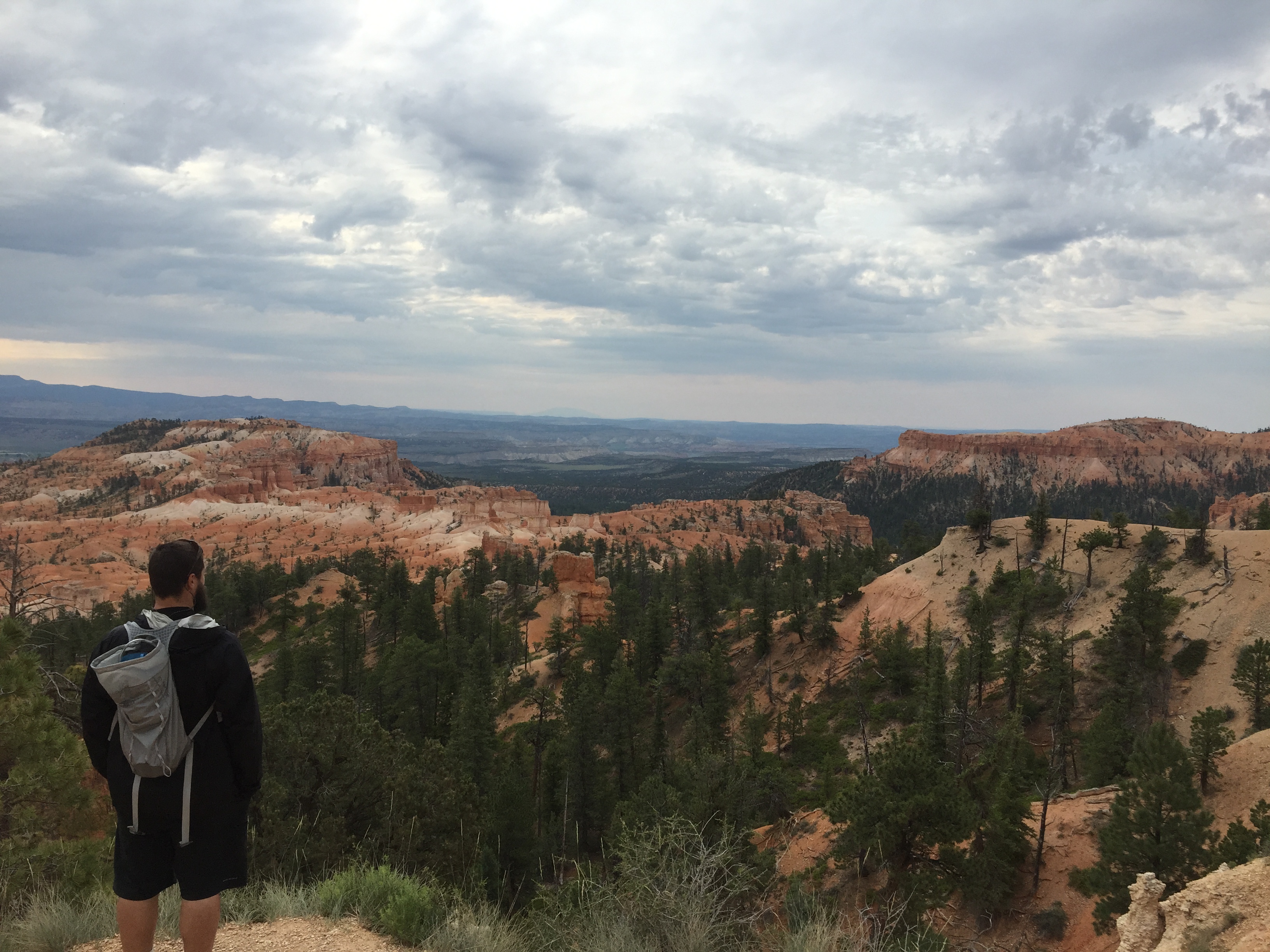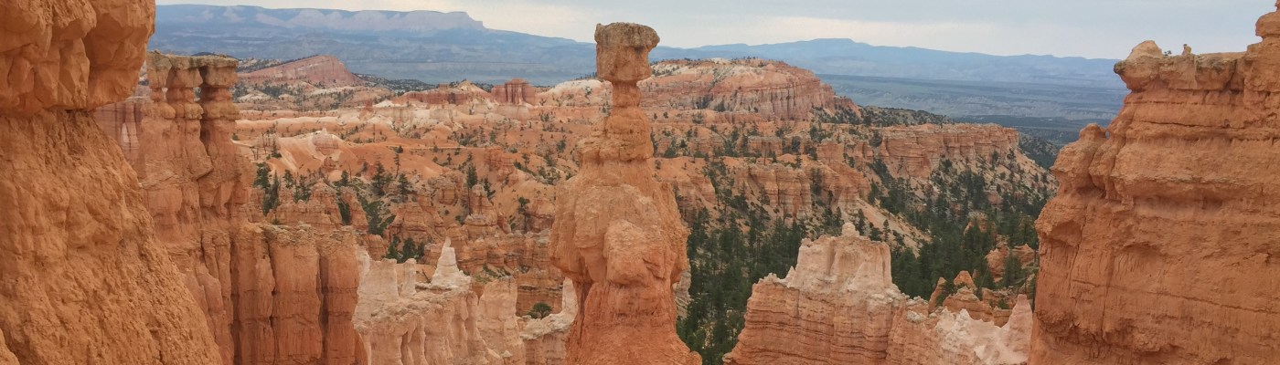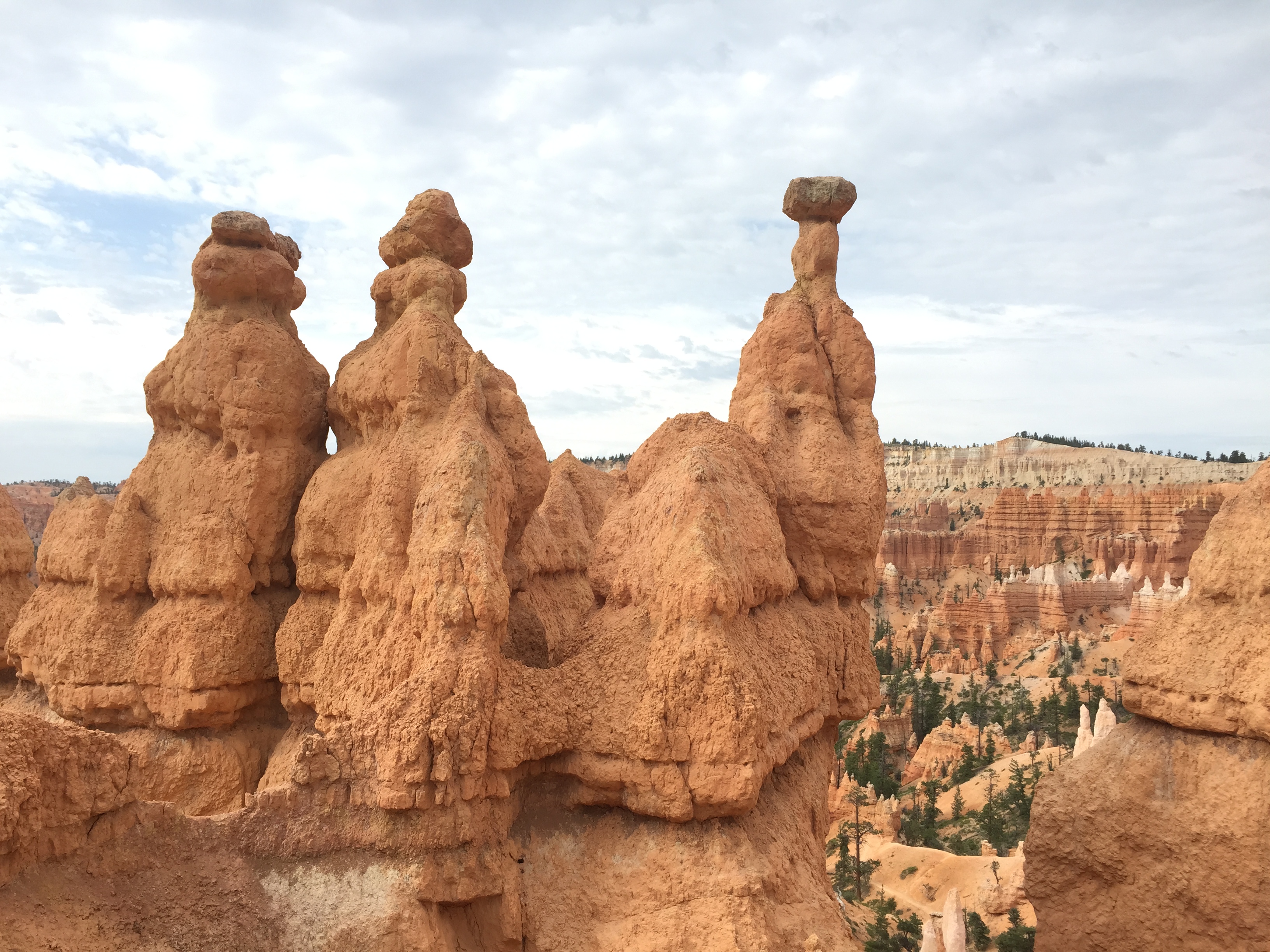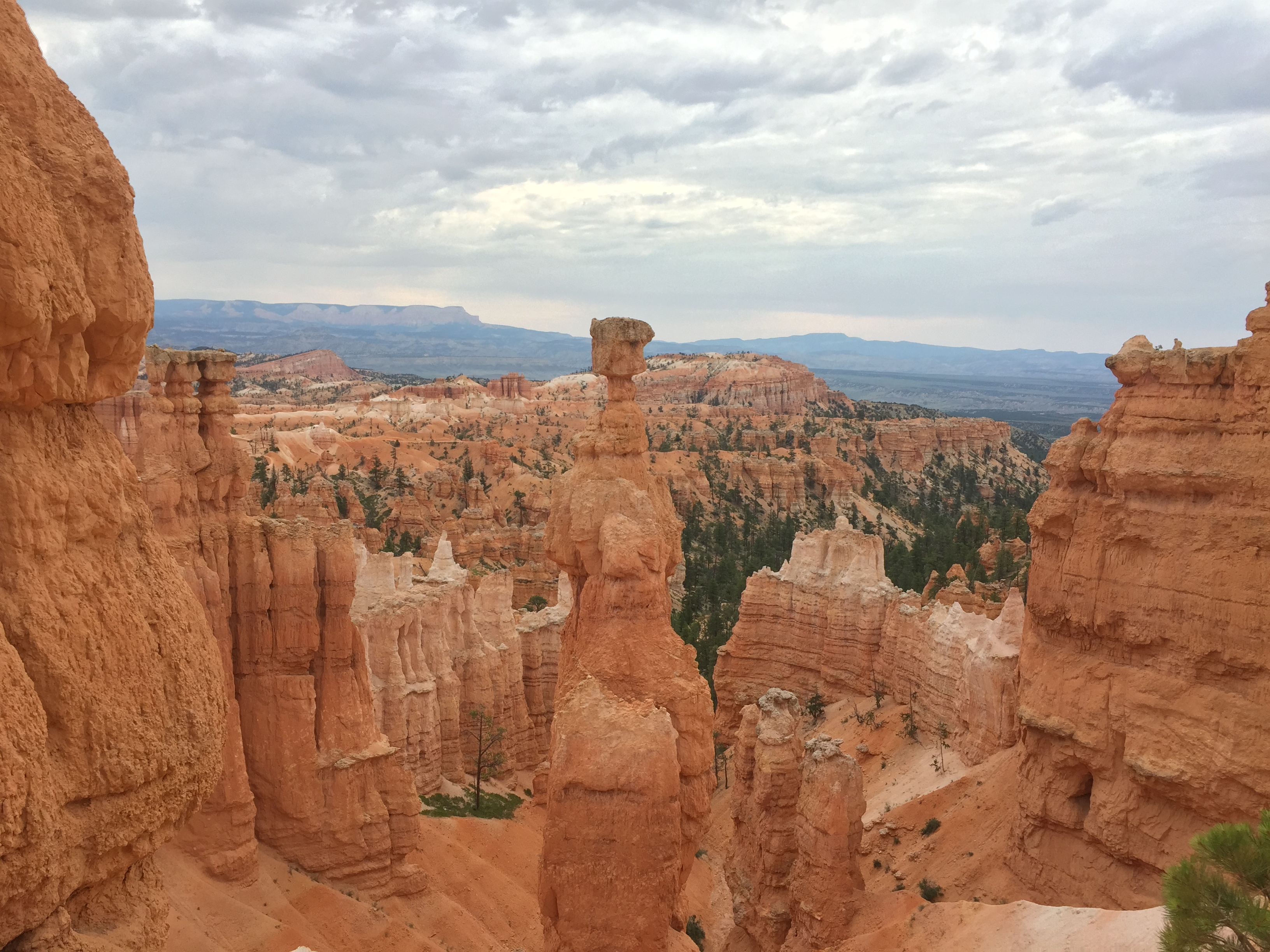 The orange, red, and yellow “hoodoos” are wind and rain-carved masterpieces. We just did a short hike – some combo of several little routes between Sunrise and Sunset Points, mostly the Navajo Trail – but holy smokes it was like entering a different world. So happy we had breezy, overcast weather. It turned what could have been a hot and dry morning into a perfectly temperate and cool day. Also, the more time we’ve spent in various parks, the more I’m realizing that direct, midday sunlight is tough on the eyes and the camera (in that the brightness washes out some of the deep colors and depths of the landscapes), not to mention pale-skinned weaklings like myself. Dawn, dusk, and storms really bring the drama and light play in some of these stunning vistas and provide a little relief from the mid-summer heat.